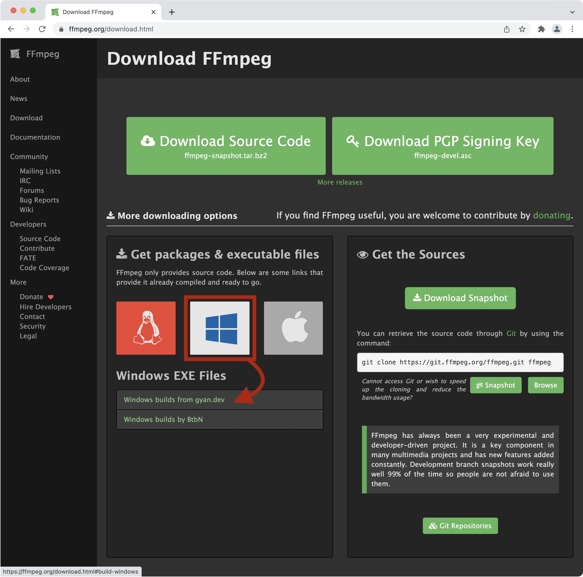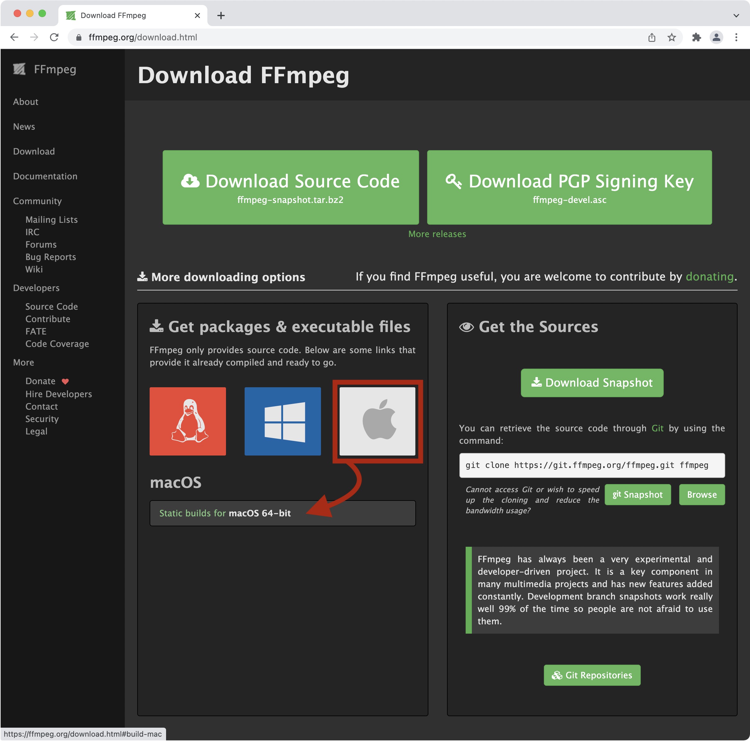转到 “获取包和可执行文件” 部分,将鼠标悬停在动作系统上以显示下载 ffmpeg 的源代码。