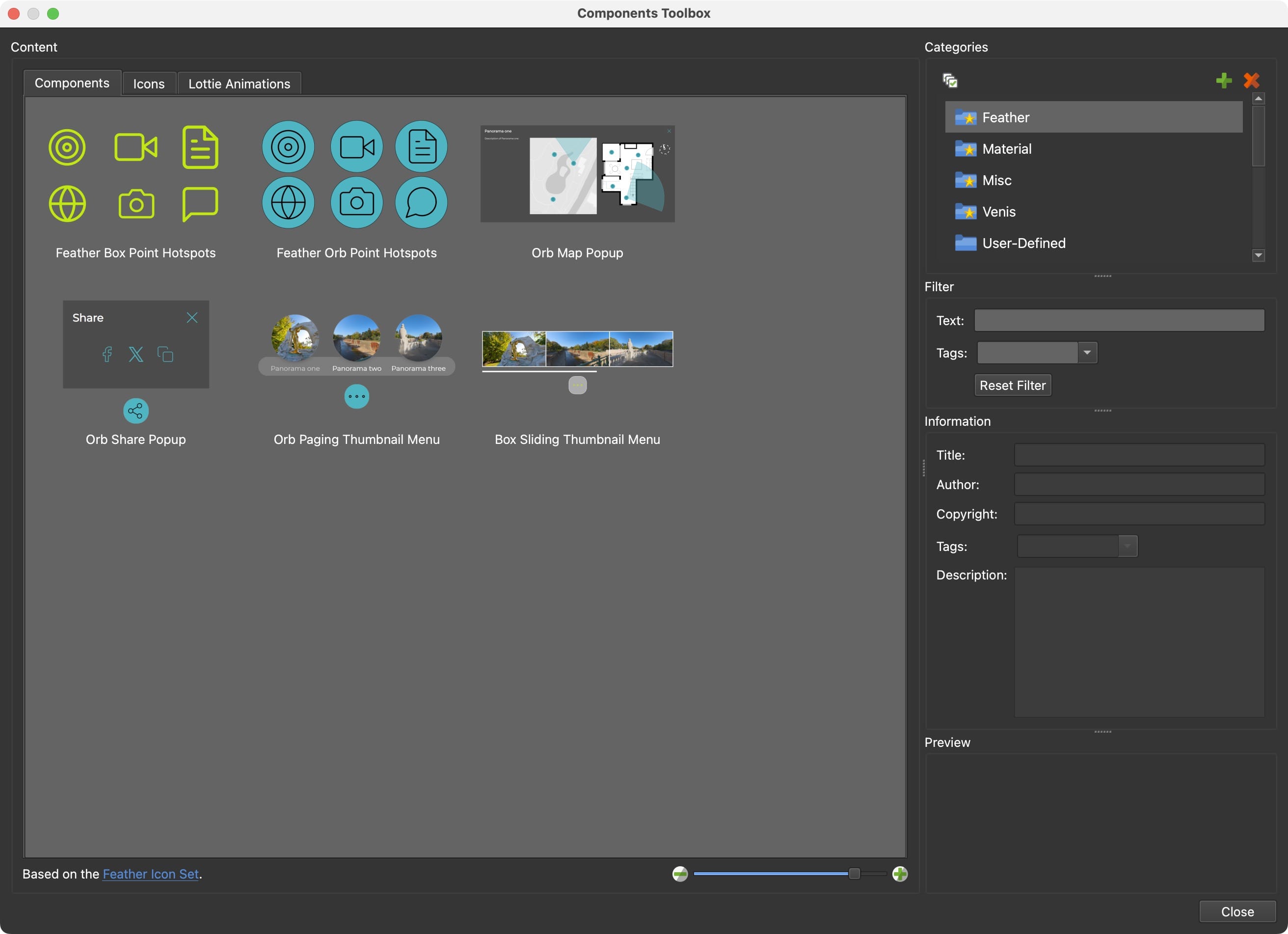 组件工具箱是 Pano2VR 中的一项功能,允许您存储皮肤元素,以便在不同项目之间重复使用或共享。它带有可免费使用的内置组件。