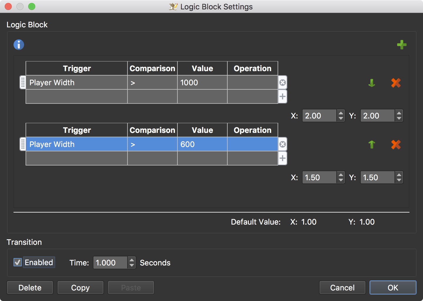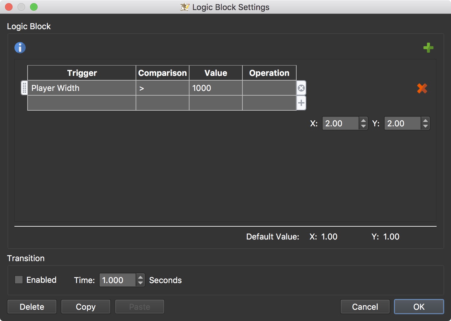 单击绿色加号以添加另一个表(表达式)。为目标添加玩家宽度 ,并将比较设置为大于 (>)。值为 600。