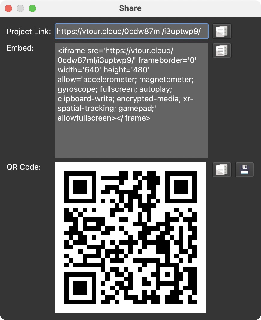 复制并共享项目的 URL,复制嵌入代码以嵌入到您的网站中,或复制并保存 QR 码以添加到您的网站或印刷媒体。