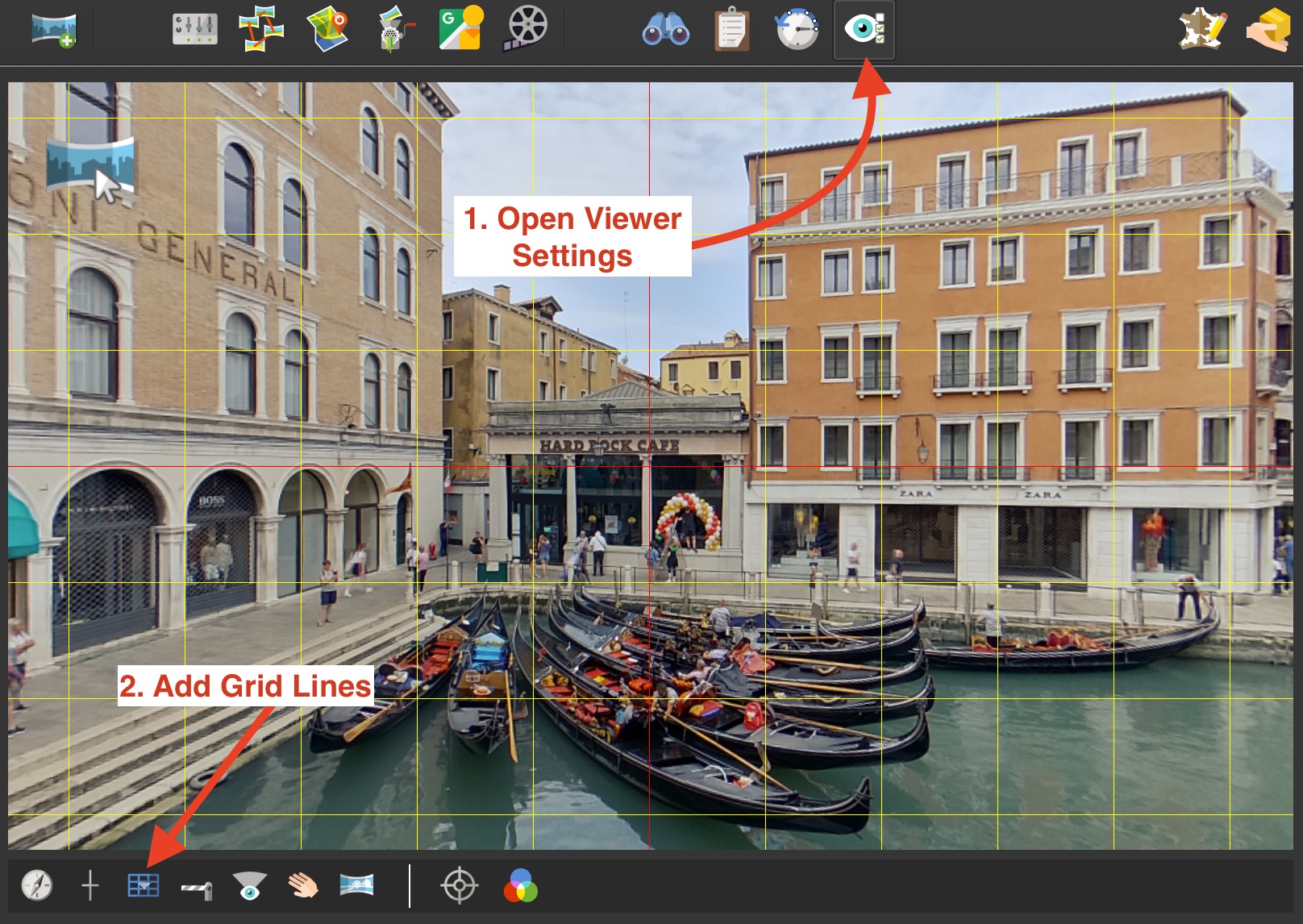 添加网格线以帮助对齐水平线和垂直线。打开查看器设置 ,然后单击切换网格按钮。要定义网格步长数并更改网格颜色,请按住鼠标以调出网格属性。