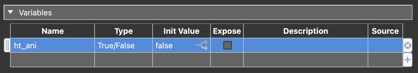 添加一个名为ht_ani的变量 。类型 = true/false,初始化值 = false。