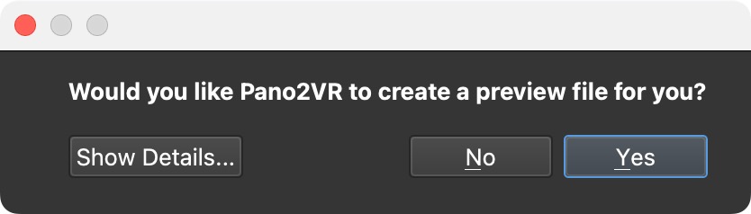 系统会询问您是否希望 Pano2VR 为您创建视频预览。如果选择是,Pano2VR 将创建一个预览文件,该文件将在视频开始之前在全景播放器中用作海报图像。这样,如果视频没有完全加载,至少那里有一些东西,而不是黑“洞”。如果您选择创建预览文件,请为该文件命名并为其选择一个位置。