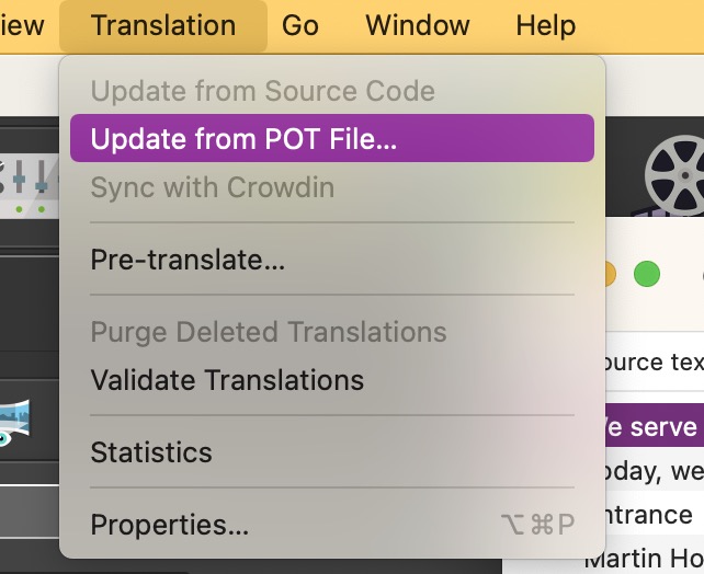 在 Poedit 中,转到 “翻译” 菜单,然后选择“ 从 POT 文件更新 ”。PO 文件现在将包含新内容,可供翻译。