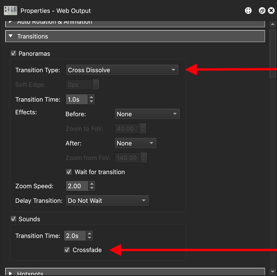 (可选)添加转场。例如,在节点之间添加交叉融合,以从一个节点平滑地移动到下一个节点。在 “过渡” 窗格中,选择“ 全景图”以启用过渡。从菜单中选择任何过渡。将其余部分保留为默认值。