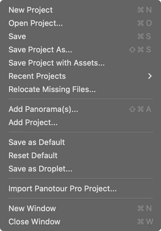 添加项目 – 选择以将 Pano2VR 项目文件 (.p2vr) 添加到当前项目。自定义地图和平面图也将与所有节点设置一起添加。