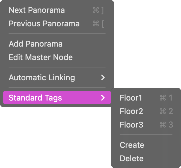 标准标签 – 可以使用分配的键盘快捷键快速将这些标签应用于游览浏览器中的节点。标签在菜单中设置并保存在 Pano2VR 中,使其可用于每个 Pano2VR 项目。