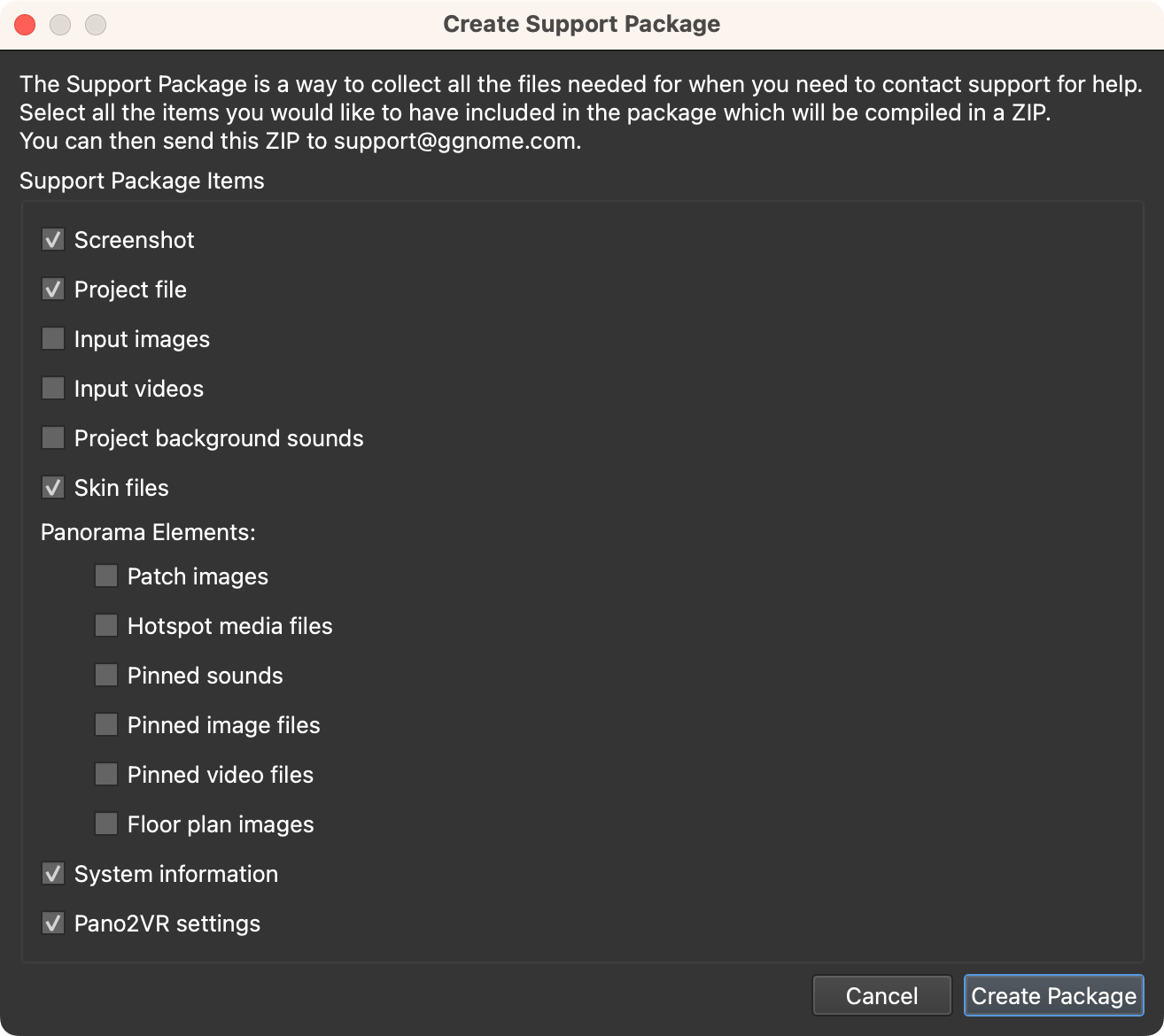 创建支持包 – 如果您需要帮助并需要联系我们的支持团队,您可以使用它来收集支持团队需要帮助您的所有文件。选择所需的文件,然后点击创建包 。Pano2VR 将收集文件并将它们打包成 ZIP 格式,准备发送给我们的支持团队 。如果您不确定要发送哪些文件,只需坚持默认选择(屏幕截图、项目文件、皮肤文件、系统信息、Pano2VR 设置)。
