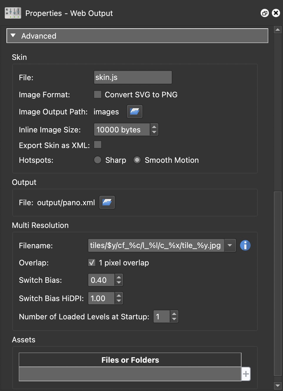 Web 输出属性在“属性”面板中打开。您可以在此处设置基于播放器的参数,例如上下文菜单、HTML 文件和多分辨率设置。