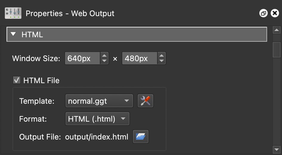 从格式列表中选择 Web 输出时,将显示以下设置。Web 输出的更多属性将在属性面板中打开。