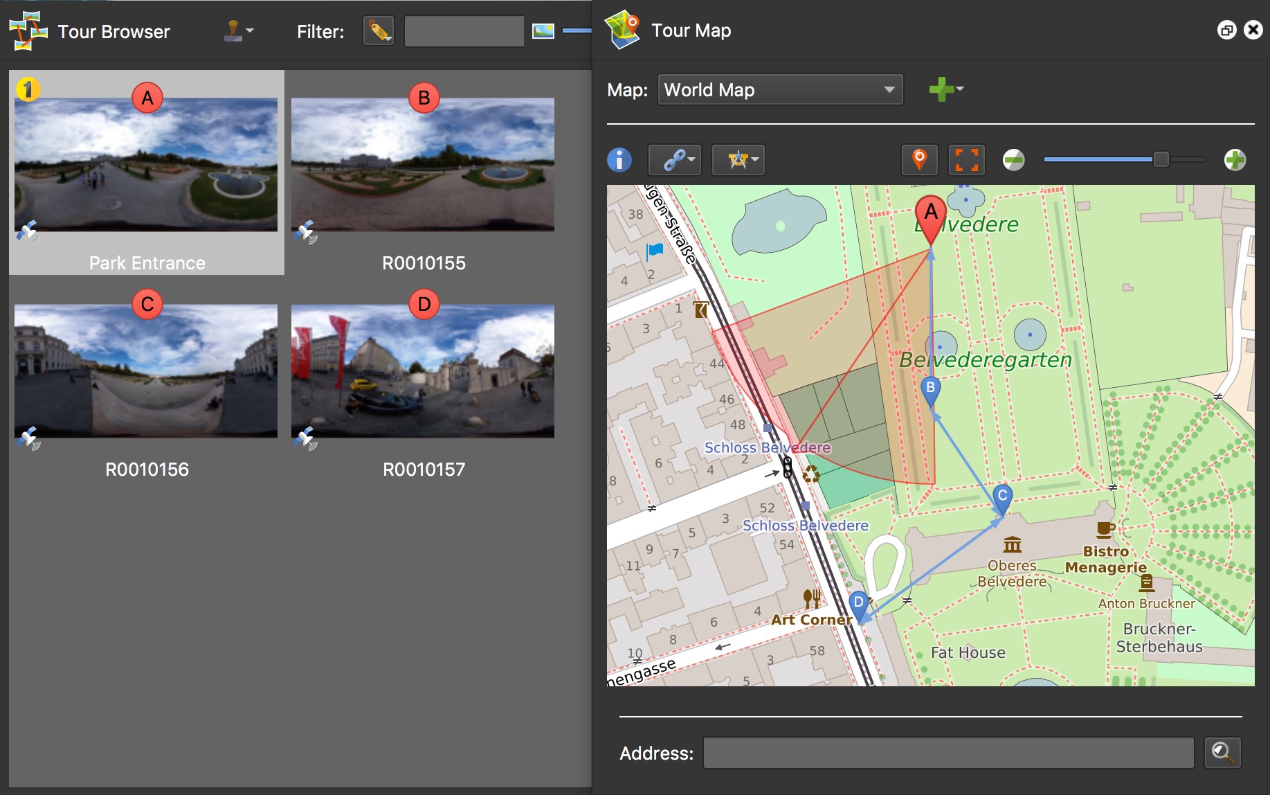 在游览浏览器和地图中显示地图标签 – 选择此选项可打开游览浏览器和游览地图之间的协调标签,从而更轻松地识别游览地图中的节点。