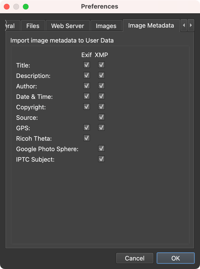 在这里,您可以选择要从图像中导入的 Exif 和 XMP 数据。