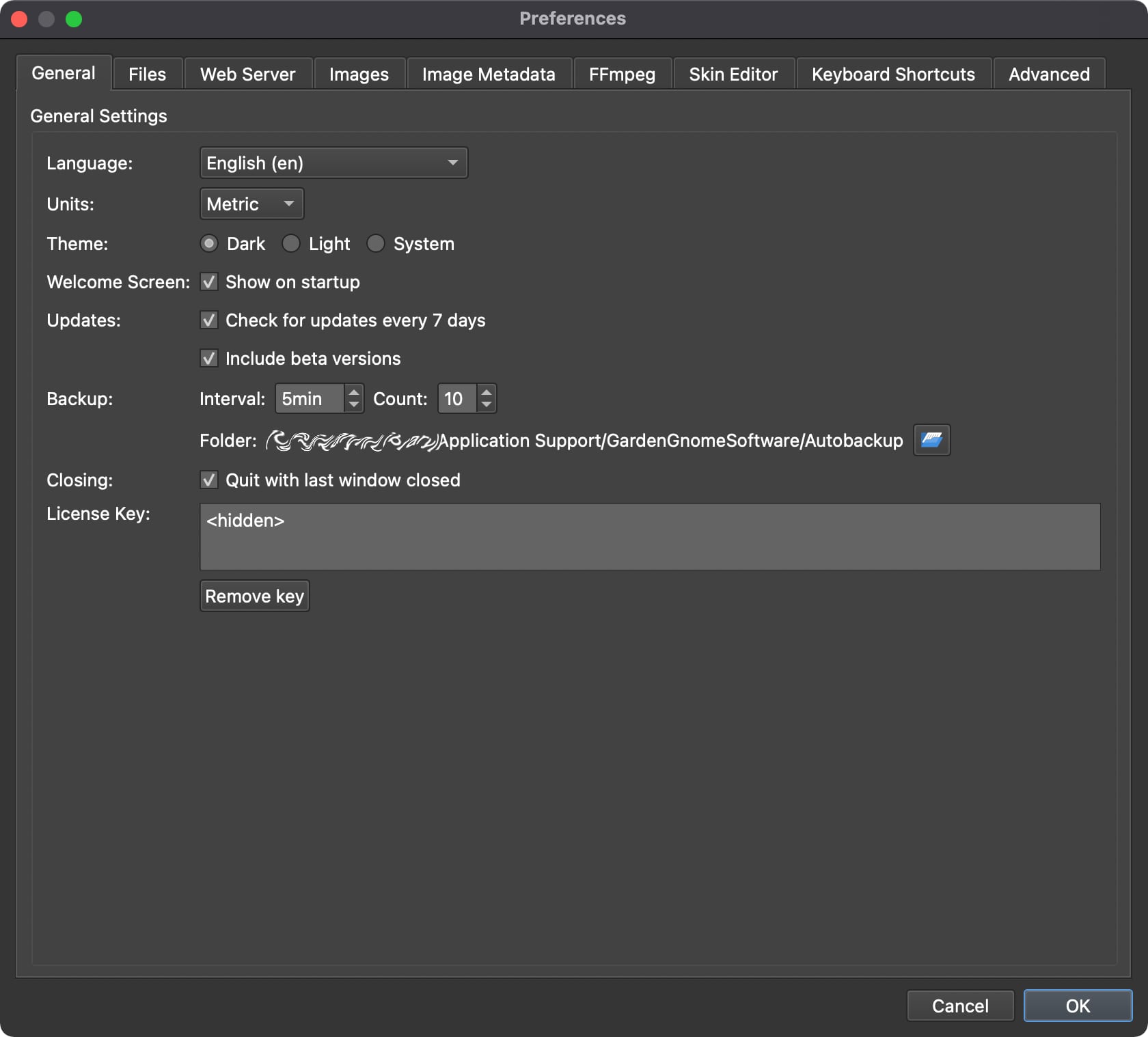 许可证密钥 – 在此处添加您的许可证密钥。添加许可证后,框中将显示 <hidden>。单击 “删除密钥” 以删除密钥并返回“试用模式”(或选择文本并点击删除)。要添加新密钥 (例如升级时),请单击 “删除密钥 ”并将新密钥粘贴到框中。