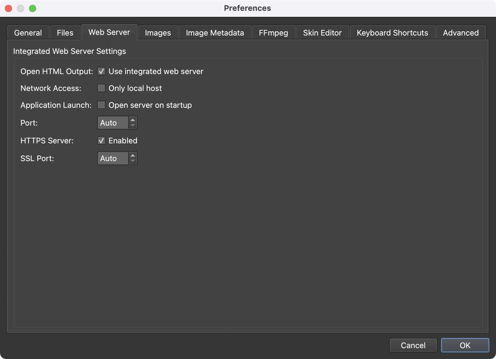 启动时打开服务器 – 选择此选项可在 Pano2VR 打开时打开并运行 Web 服务器。