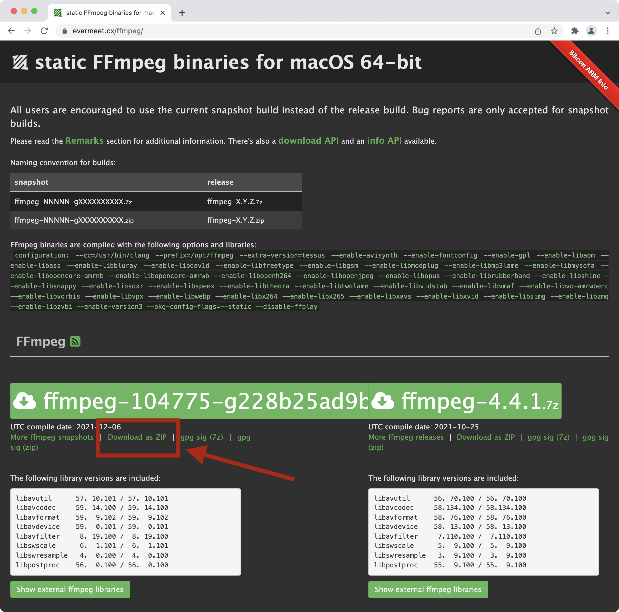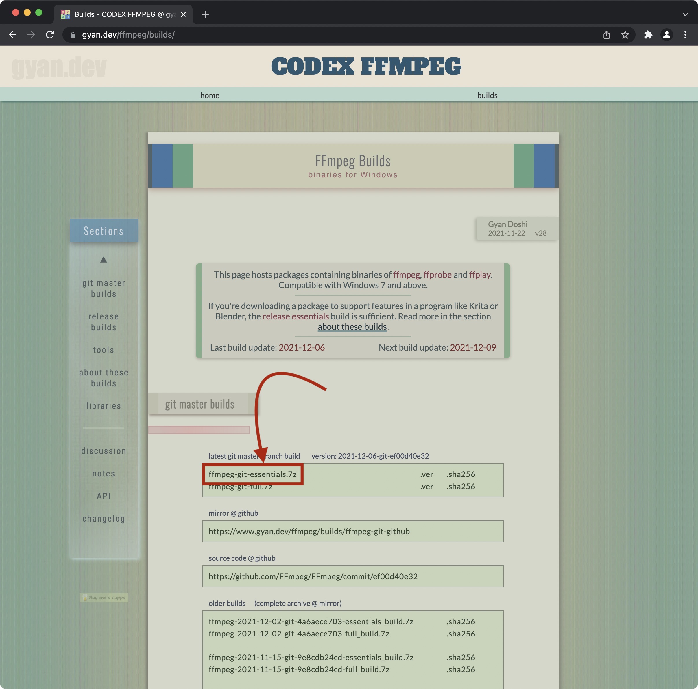 转到 “获取包和可执行文件” 部分,将鼠标悬停在动作系统上以显示下载 ffmpeg 的源代码。