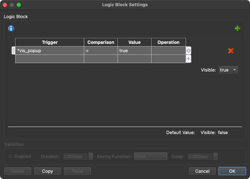 在外观设置中, 取消选择可见并添加逻辑块 ,以仅在变量为 true 时显示弹出窗口: -