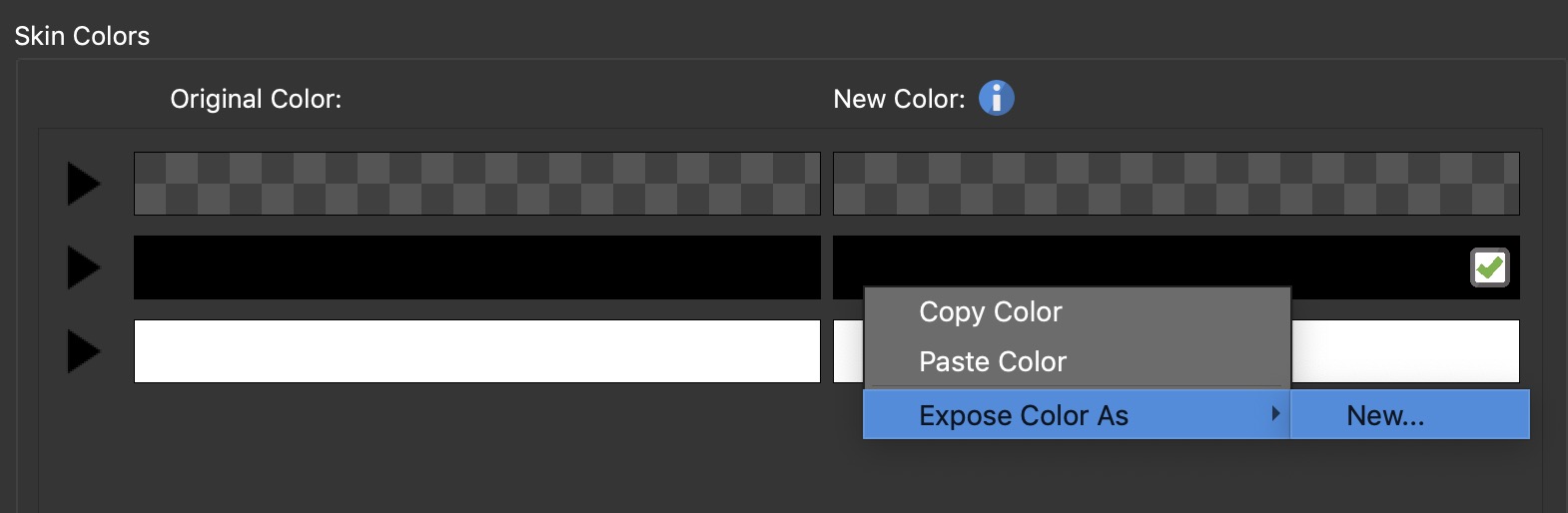 您可以在皮肤中显示颜色,以便可以在输出面板中快速编辑皮肤的颜色,而无需打开皮肤编辑器。这称为暴露。