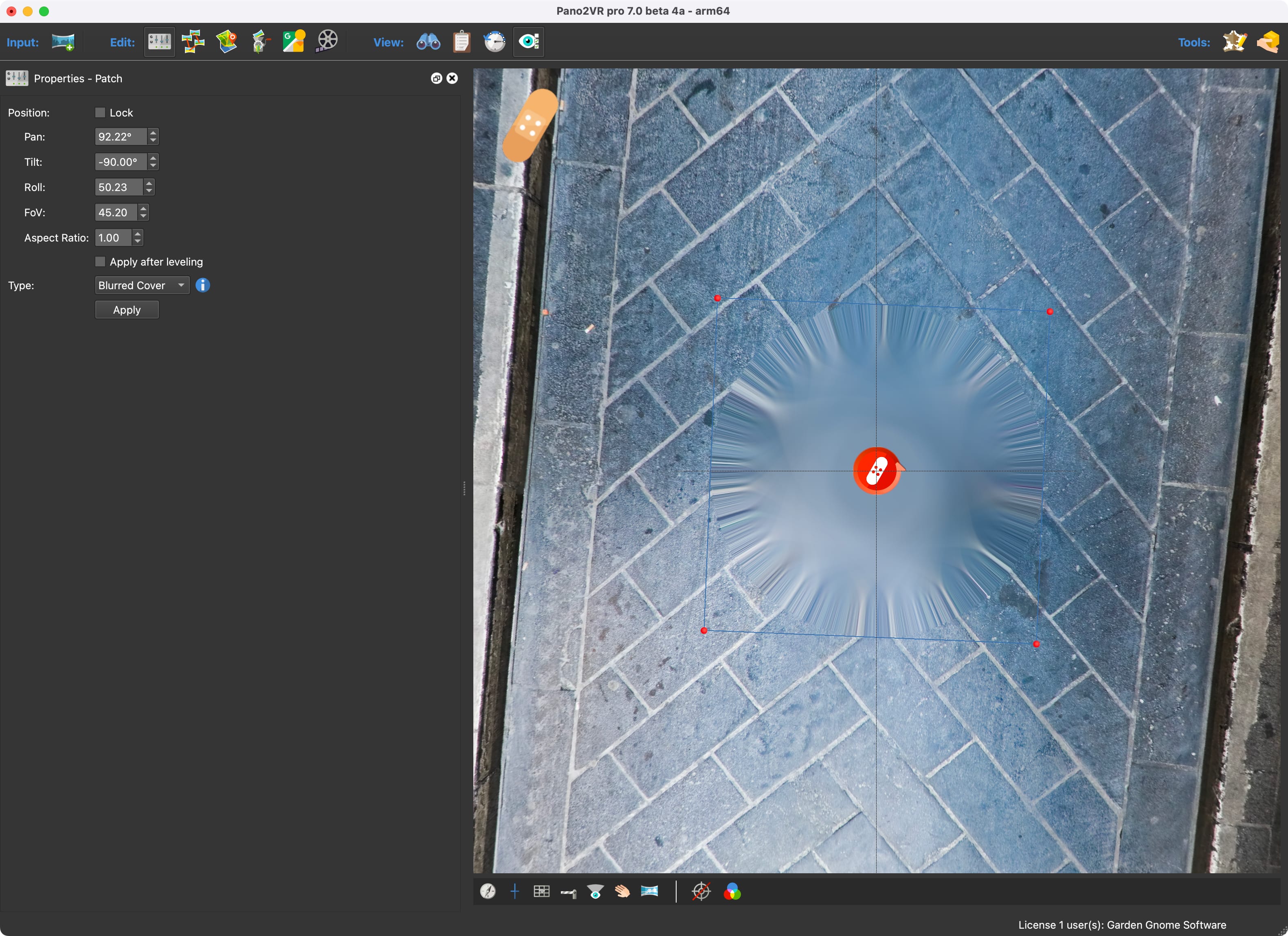 将全景图向下指向三脚架并添加贴片。补丁将捕捉到最低点。