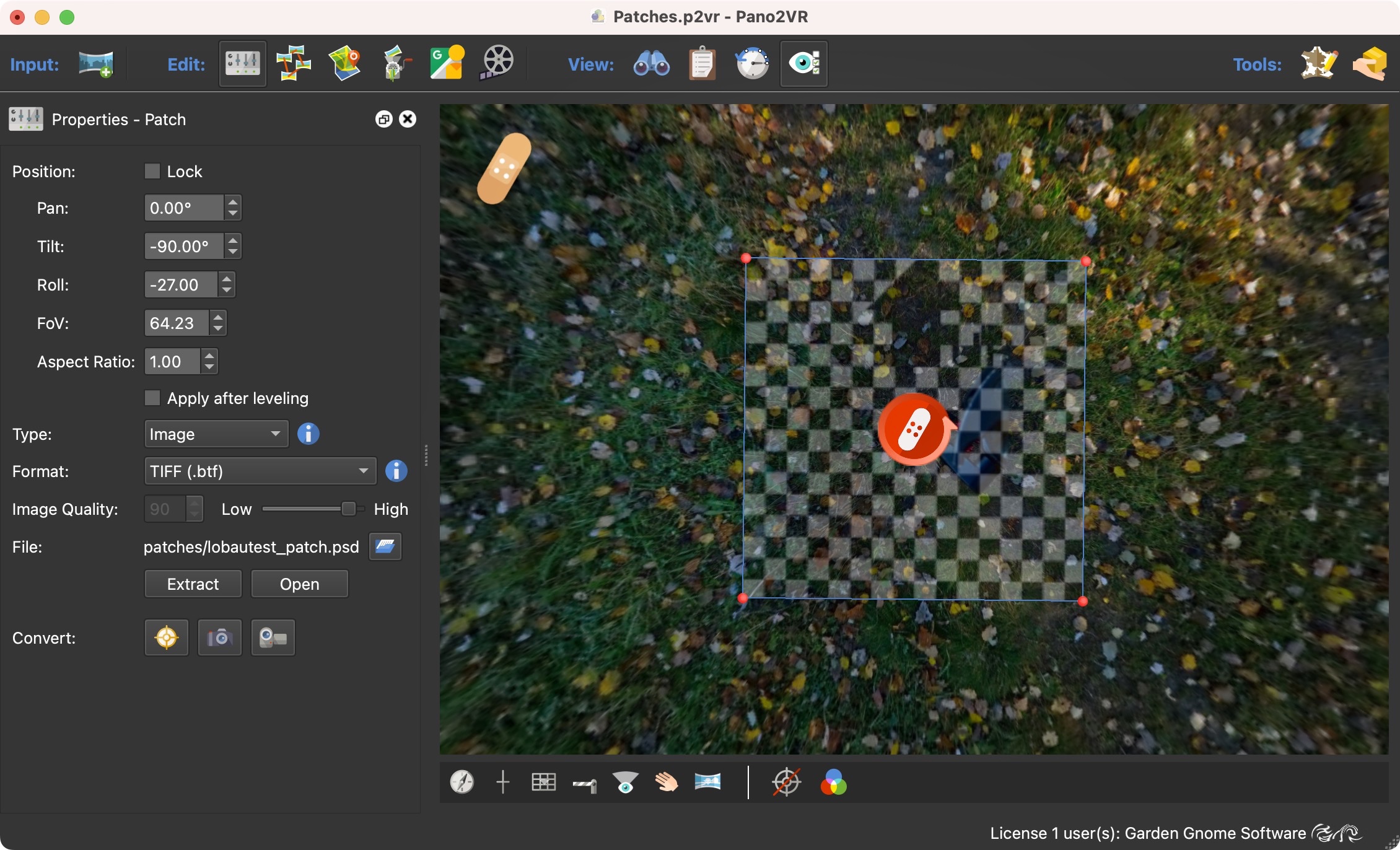 将全景图加载到 Pano2VR 或打开现有项目后,从查看器模式打开 Patch 模式或按键盘上的 A。
