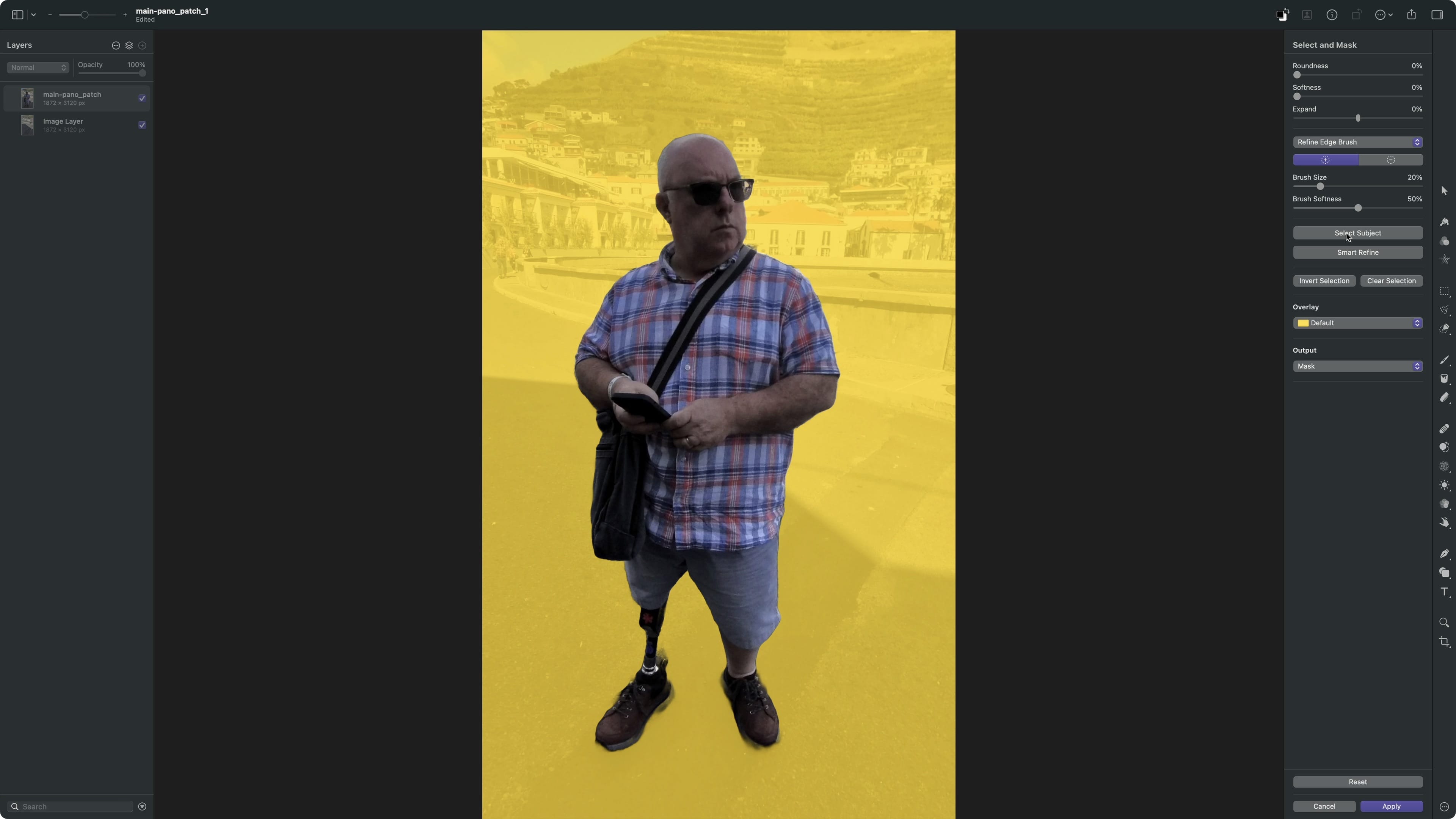 使用任何方法从图像中删除对象。在我们的示例中,我们使用“选择主题”并删除了主题。然后使用画笔柔化蒙版的边缘。