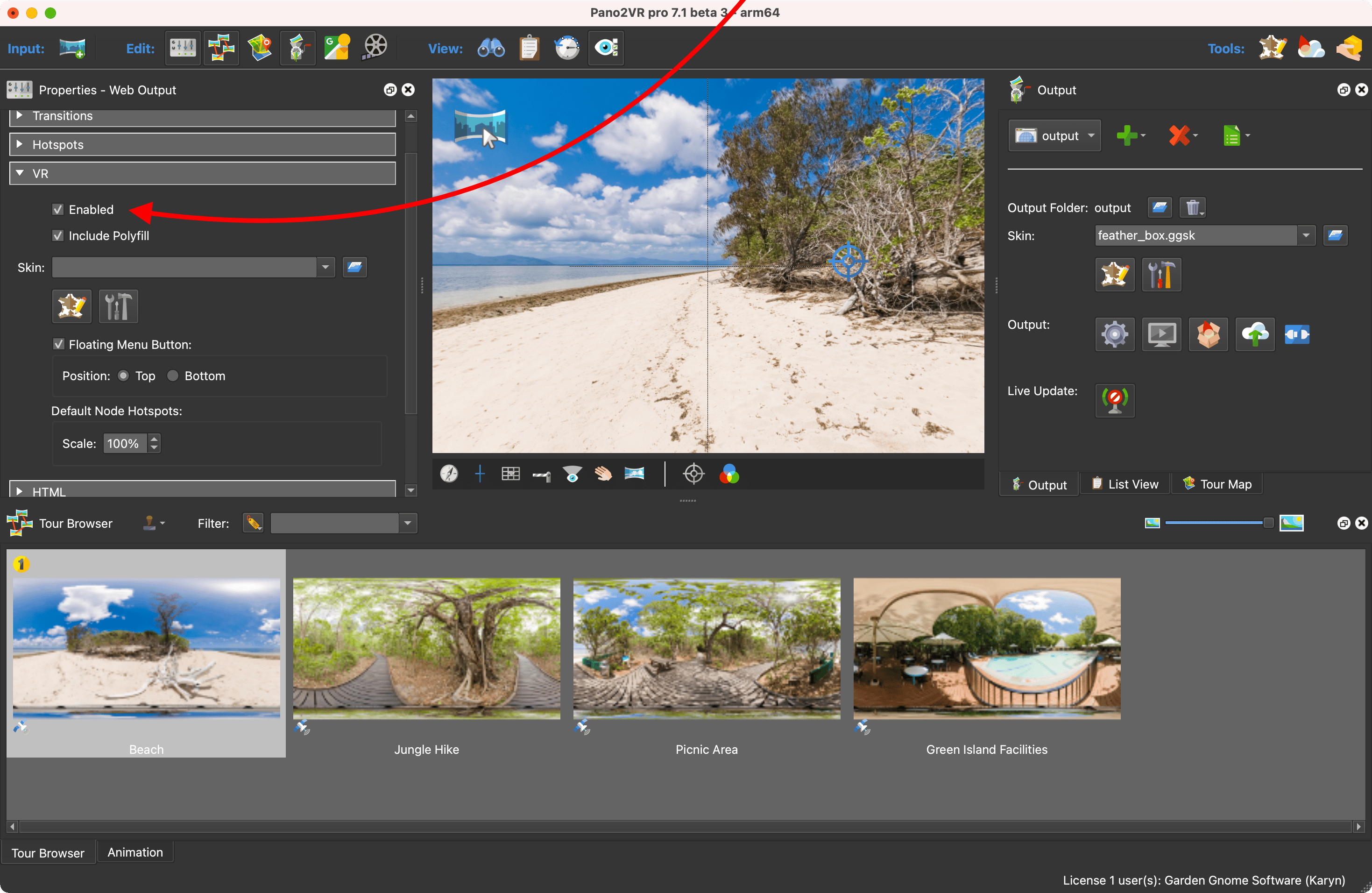 在 Web 输出属性(Web Output Properties) 中,找到 VR 属性。确保 已选择 启用(Enabled) 。