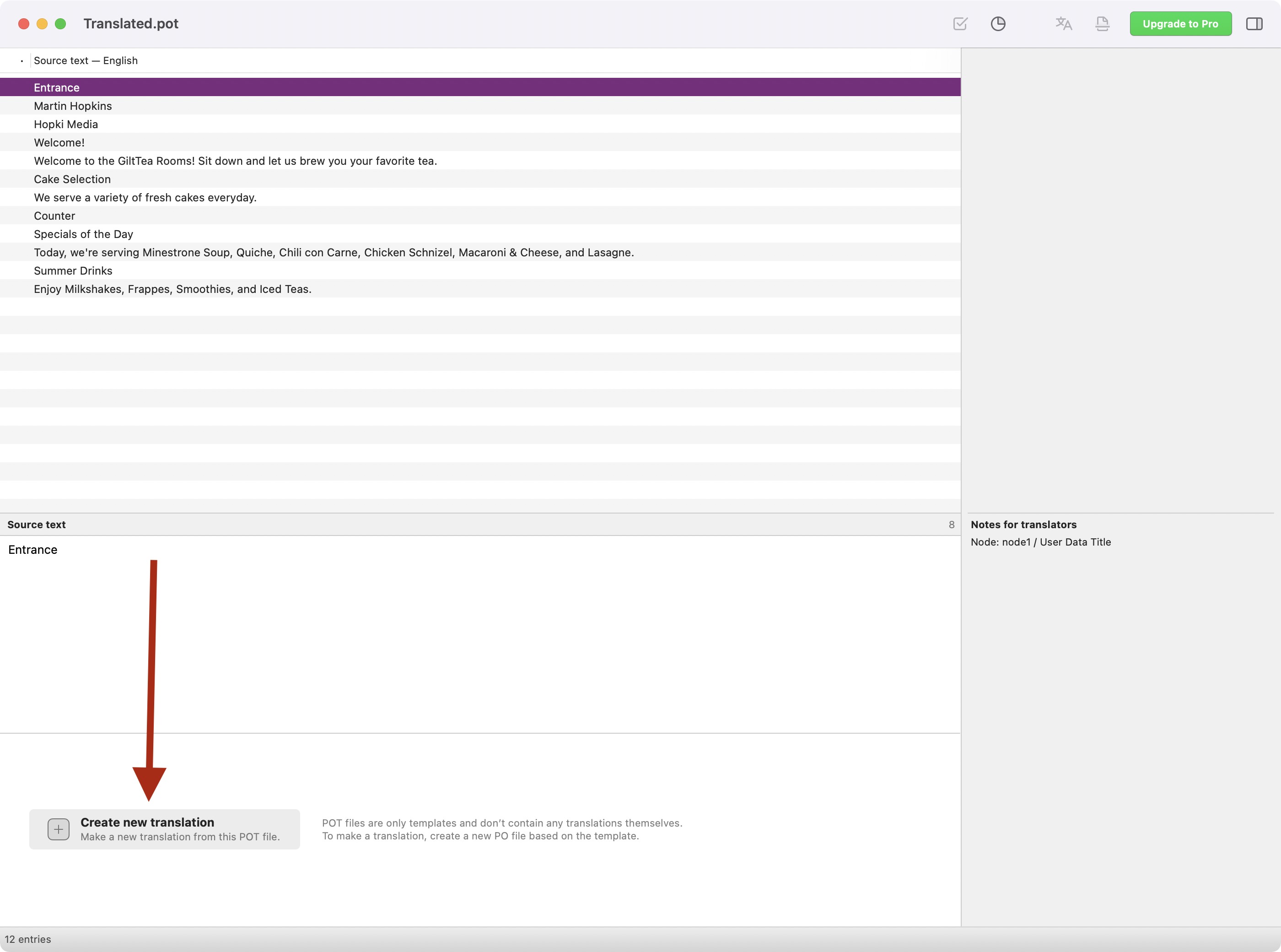 在 Poedit 中打开模板文件。请注意,它是一个模板文件,而不是翻译文件。