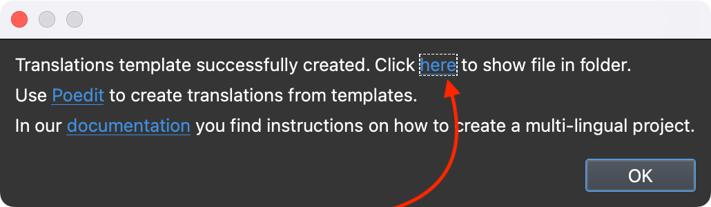 单击生成翻译模板按钮 。这将自动创建翻译模板文件并将其添加到翻译文件夹中。这是一个与 Poedit 兼容的 POT 文件。