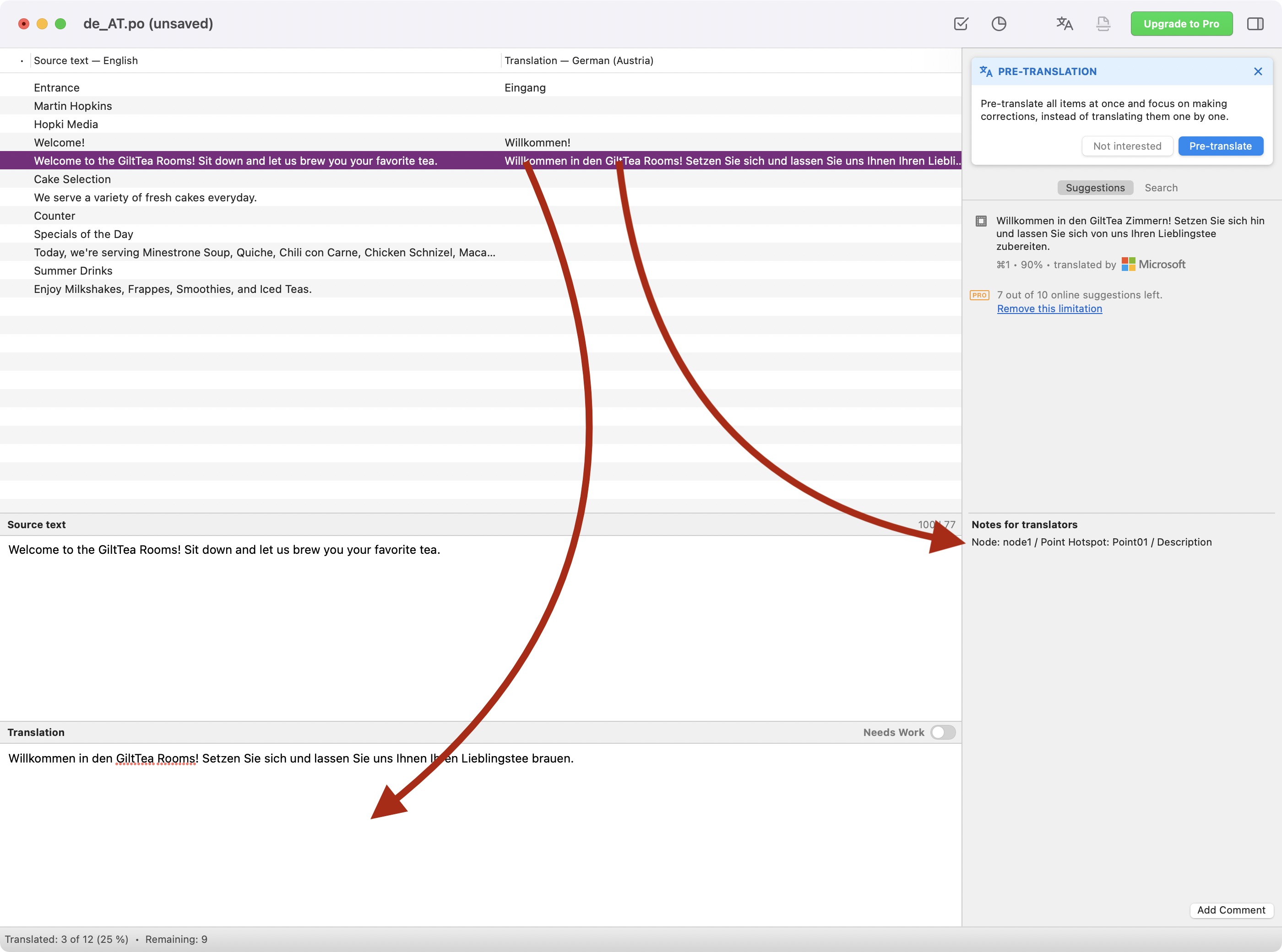 现在,您可以通过选择一行开始翻译,然后在屏幕底部的“翻译”中输入翻译。在右上角的面板中,有建议的翻译,您可以通过单击它们来使用它们。但是,在免费版本中您只能使用 10 次。之后,系统会要求您升级。