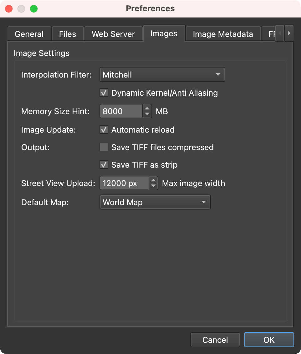 用户可以在菜单栏中找到用户首选项/设置。选择 文件>设置 在 Windows 和 Linux 上;以及 Mac OS 上的 Pano2VR >“偏好设置”。